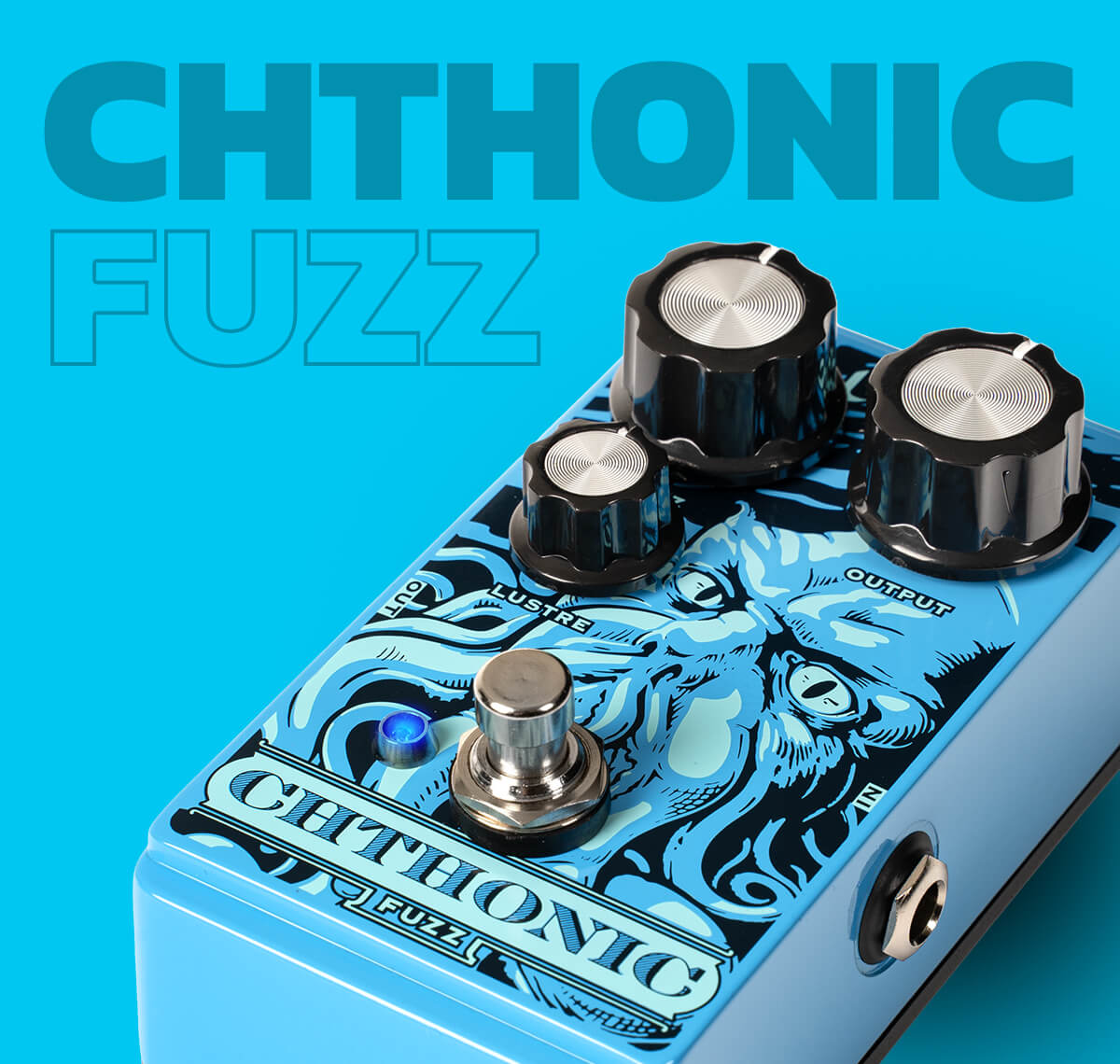 Footswitch per l’inserimento/disinserimento dell’effetto fuzz, Led blu a segnalarne l’attivazione e prese a jack In/Out ai lati dello chassis; quest’ultimo in alluminio con grafica "Kraken/Cthulhu" su fondo azzurro.