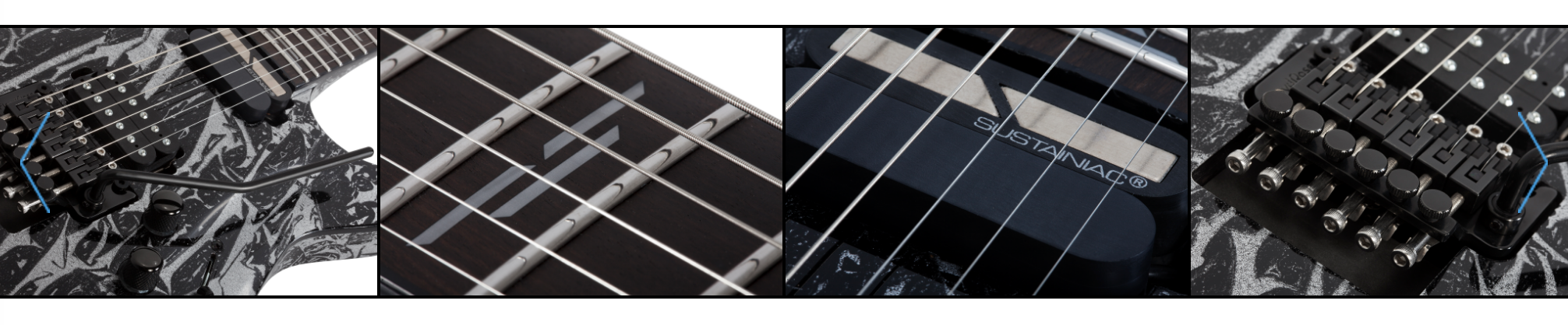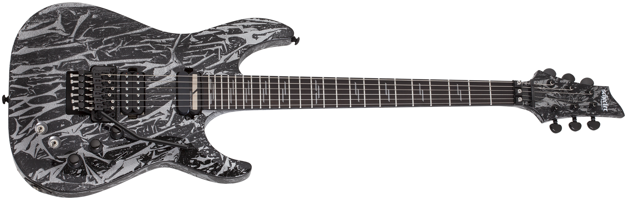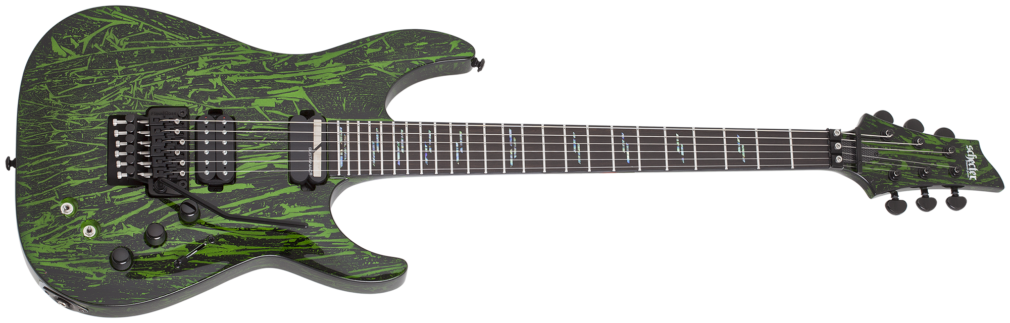 Chitarra elettrica 6 corde – Costruzione: Set-Neck (Ultra Access) – Body: Mogano – Top: Arched – Manico: Mogano (3pcs) con rinforzi in fibra di carbonio, sezione Thin C – Truss rod: regolabile – Tastiera: Ebano – Scala: 25,5” (mm 648) – Tasti: 24 X-Jumbo – Radius: 14” (mm 355) – Segnatasti: Lines – Nut: (mm 41,3) Floyd Rose 1500 Series – Dot: Luminlay Glow in the Dark – Pickup: Schecter USA Sonic Seducer (ponte) e Sustainiac (manico) – Controlli: Volume/Tone/Intensity – Selettore: 3 posizioni – Meccaniche: Grover Rotomatic 18:1 – Ponte: Floyd Rose 1500 Series – Finitura hardware: Black – Finiture body: Silver Mountain e Toxic Venom – Made in South Korea