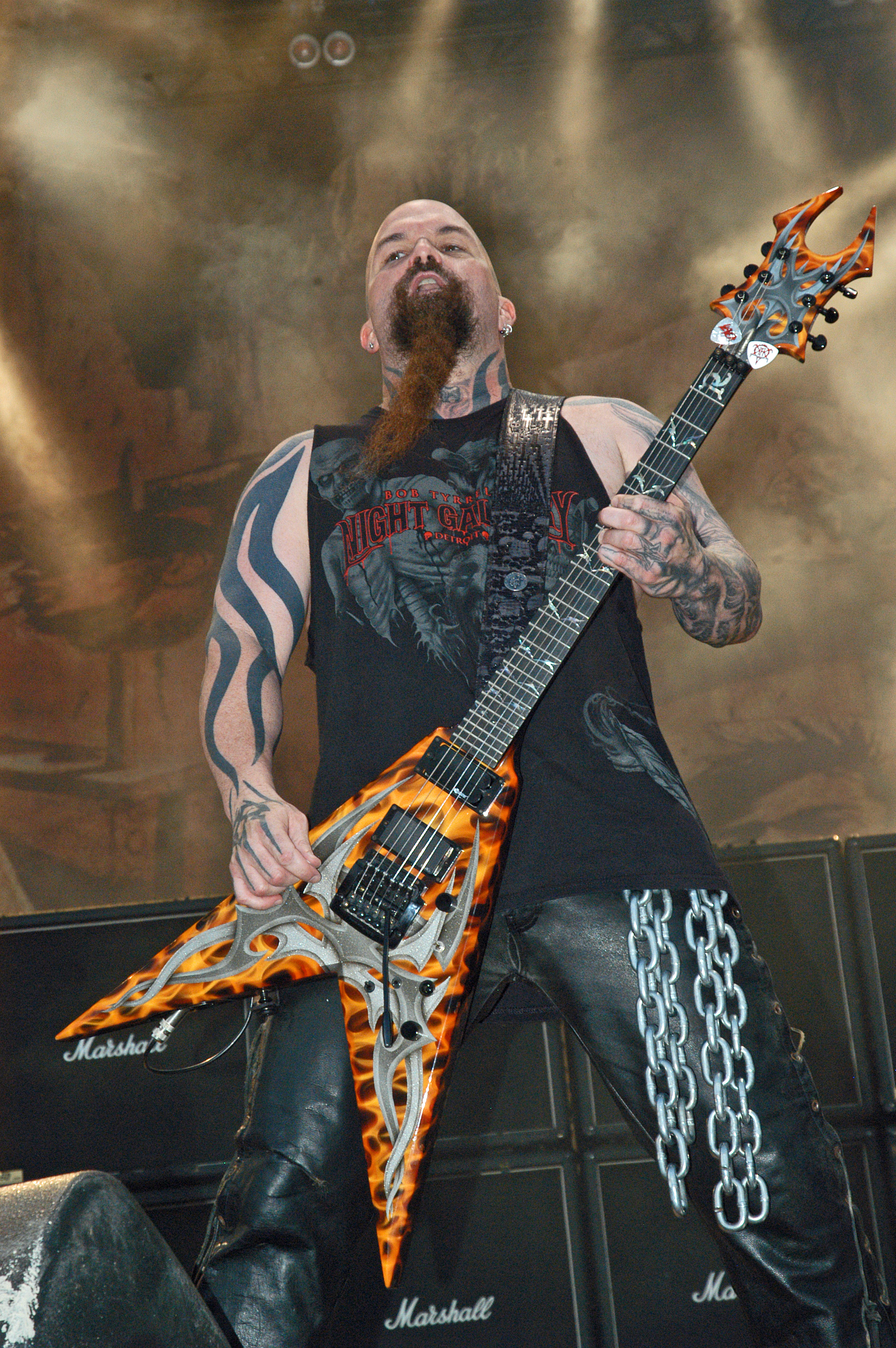 Il segno distintivo di Kerry sono i tanti tatuaggi che ha sul corpo, così un giorno la rivista Blender gli offre un tour negli USA per la promozione della nobile arte!? Chitarristicamente parlando, è innegabile che Kerry King abbia messo il suo segno distintivo negli anni Ottanta in ambito thrash metal. Una bandiera tenuta alta per tutti i Novanta sino a oggi, almeno sino alla morte di Jeff Hanneman...