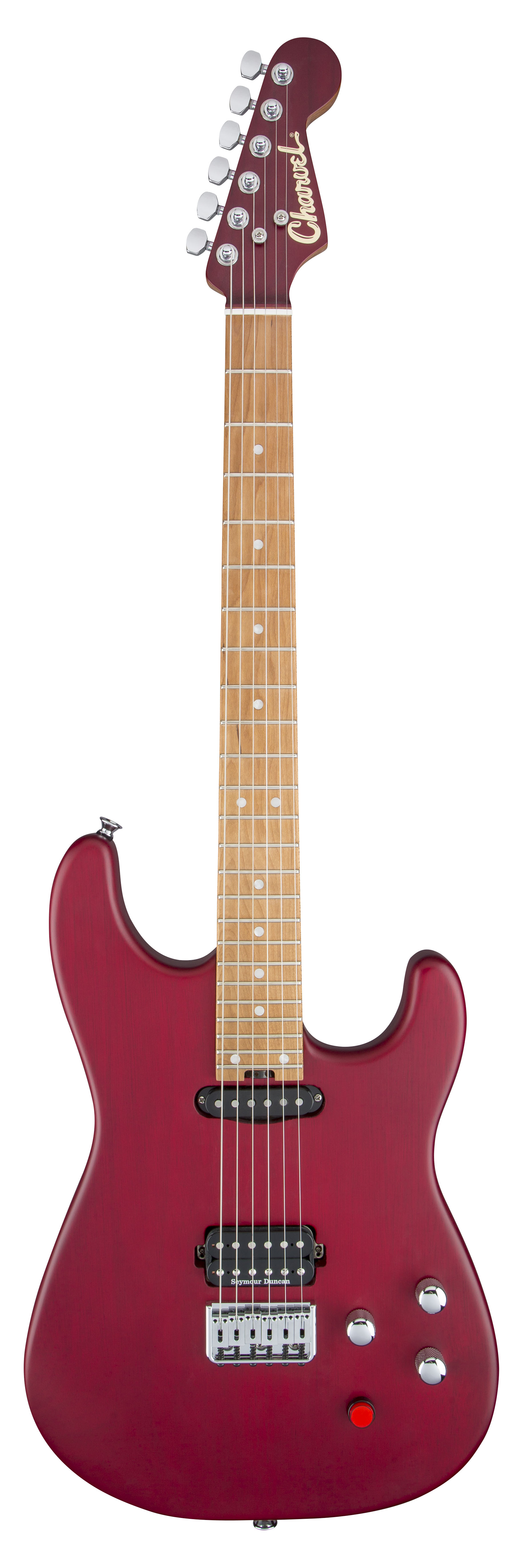 Shape: San Dimas – Costruzione: Bolt-on – Body: Mahogany – Body Finish: Trans Red – Manico: (2 pcs) Caramelized Maple con rinforzo in grafite – Trussrod: Heel-Mount Truss Rod Adjustment Wheel – Scala: 25,5” – Nut: Standard Stratocaster – Tastiera: 12”/16” Compound Radius –Tasti: 24 jumbo – Segnatasti: Pearloid Dot – Meccaniche: Charvel die-cast locking – Pickup: Seymour Duncan SH6 Distorsion (bridge) e Fender Texas Special (neck) – Selettore: 3 posizioni – Elettronica: Momentary kill Switch – Controlli: Volume, Tone – Ponte: Charvel HT6 String-thru-body – Hardware: Chrome – Corde: NPS 009-042