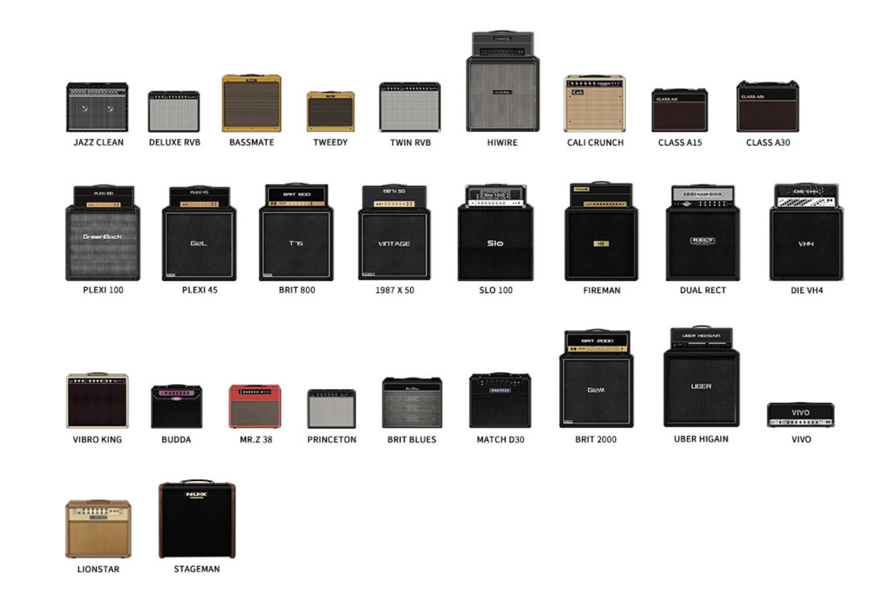 Alla base di Amp Academy Stomp c’è il potente algoritmo TSAC-4K Amp Modeling, una tecnologia di modellazione fisica evoluta, che raddoppia la complessità rispetto a quanto fatto sinora. Per supportare tale evoluzione, Nux sviluppa una piattaforma hardware di nuova concezione con due DSP dedicati, uno per gli effetti (modalità Preset e Scene) ed uno per la modellazione dell’amplificatore, quest’ultima distinta tra preamp e finale (sezione Amp Modeling), con la possibilità di optare per 27 amplificatori combinati a valvole diverse (EL84, EL34, 6V6, 6L6) o, in alternativa, per amplificatori a stato solido.