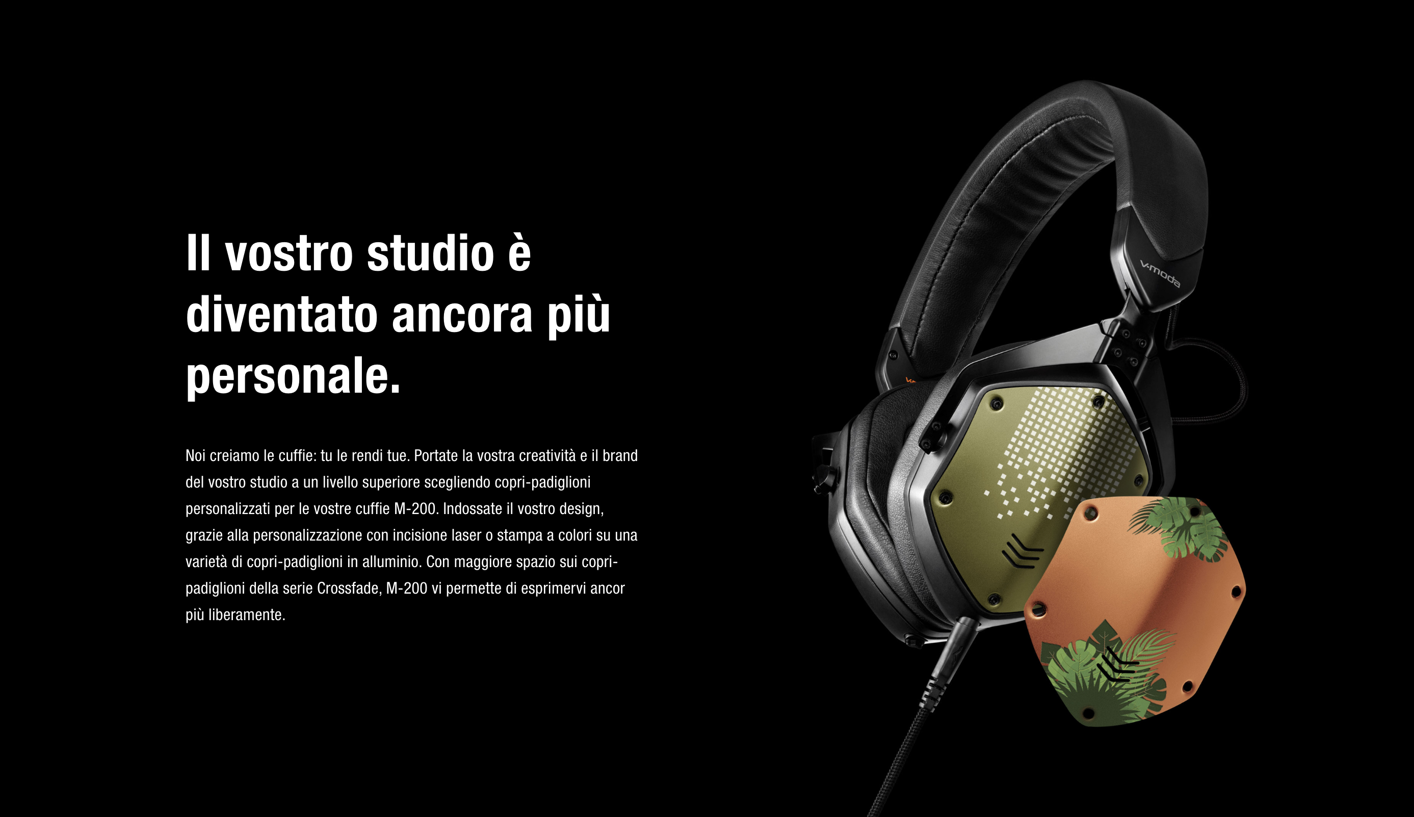 Oggi V-Moda rivolge l’attenzione alle cuffie da studio M-200 proponendo la loro customizzazione tramite il Custom Shield Kit (serie di coperchietti applicabili ai padiglioni auricolari) in sei nuovi colori: Atlas Blue, Rust Orange, Moss Green, Laser Red, Titan Gray e Brushed Black. Ciascun kit può essere utilizzato all’istante, ma non solo: è possibile richiedere l’incisione al laser o la stampa a colori di un proprio logo, nome, grafica e quant’altro. #EndorseYourself