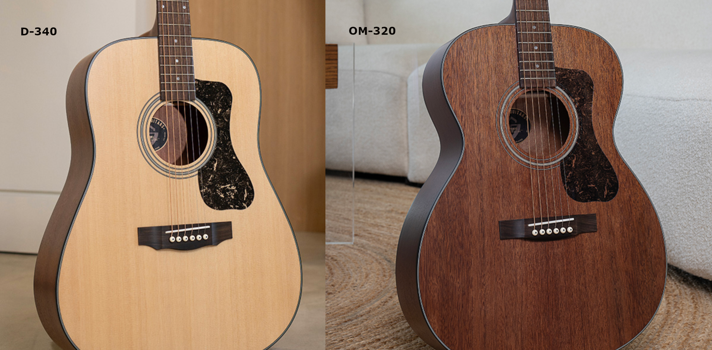 Guild sceglie l’Abete (Spruce) e il mogano (Mahogany) per le nuove seicorde 300 Series e ne distribuisce l’utilizzo per top e fondo/fasce, in base ai modelli proposti. In sostanza, l’impiego di tali legni consegna al suono una articolazione definita e una proiezione marcata (abete) ma anche una pronunciata enfasi delle medie e del volume (mogano), per una formula sonora calibrata ad hoc per ciascuna chitarra della serie. Volendo riassumere, si tratta di un suono che fa della definizione, proiezione e balance i suoi punti cardine, restituito con potenza dalle generose dimensioni della Dreadnought per lo strumming e gli stili più energici e d’altro canto restituito dalla OM per il fingerpicking o comunque per le tecniche che necessitano della massima articolazione timbrica.