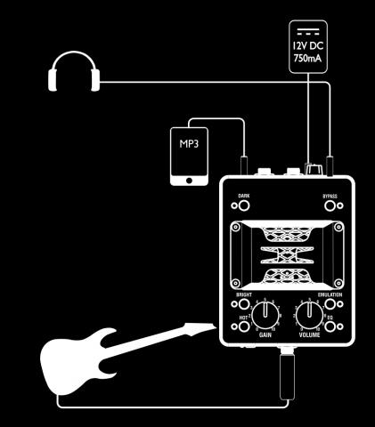 L'emulazione di speaker (4x12”) – derivata dal progetto del Laney IRT Studio – si attiva agendo sul relativo switch (Emulation), mentre attivazione/disattivazione del pedale sono gestite dal consueto Bypass che può anche essere controllato da un pedale accessorio (non incluso).