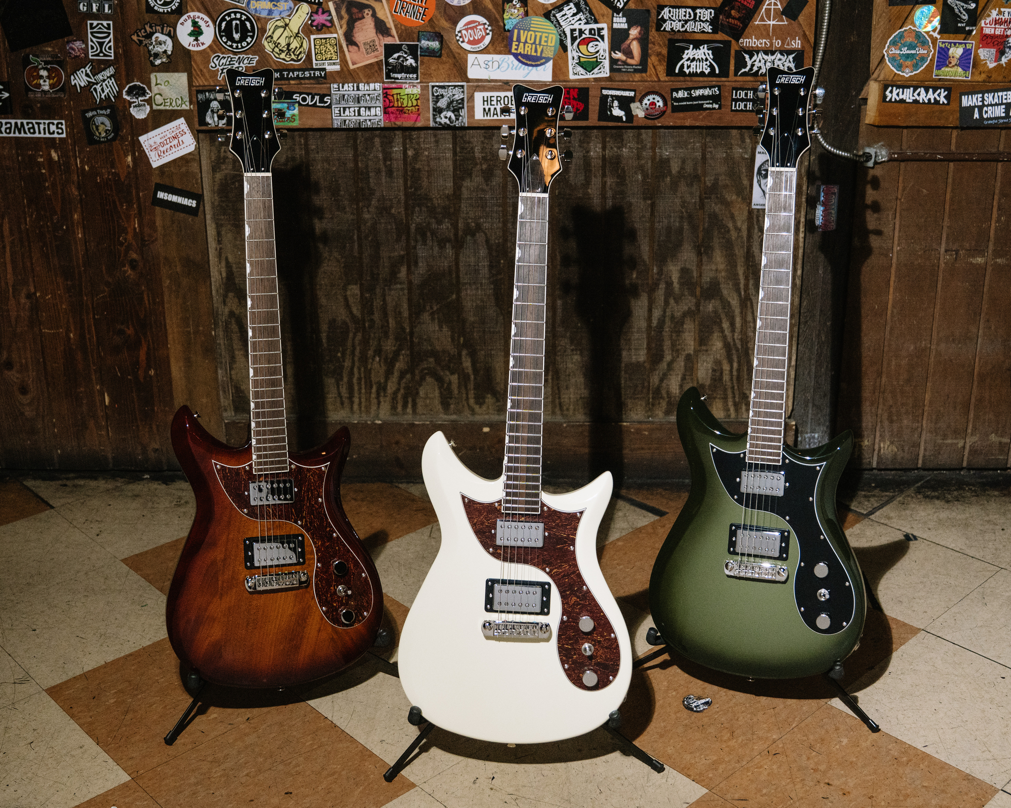 Come si diceva sopra, Gretsch non tralascia certo l’aspetto estetico e, a dare enfasi a quel tocco rétro che caratterizza la Electromatic CVT Double-Cut, la propone in tre raffinate finiture: Vintage White, Havana Burst e Wychwood.