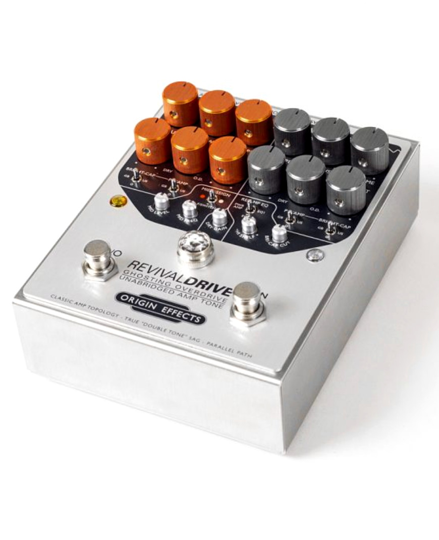 La stessa filosofia di base, questa volta rivolta a un overdrive, la percorre oggi il pedale RevivalDrive: riprodurre il sound di un ampli vintage non-master (… il tipo migliore per la saturazione) con componenti analogici e valvole sostituite da circuitazioni a transistor singoli. Ogni stadio del segnale di un ampli vintage, viene infatti riprodotto fedelmente: quindi, non soltanto il preamplificatore, l’invertitore di fase, il finale di potenza e lo stadio rettificatore, ma anche il segnale di rete sintetizzato, ed un emulatore della reazione del finale al carico da parte dello speaker. In buona sostanza, si tratta del primo pedale overdrive creato dalla britannica Origin Effects, ma anche del primo nel suo genere visto che – ricordiamolo – ricrea il percorso del segnale in un ampli valvolare tramite componenti esclusivamente analogici. Grazie a ciò, RevivalDrive riesce a originare i suoni di classici ampli americani e britannici: da molto puliti a completamente distorti, consegnando al chitarrista la possibilità di intervenire...