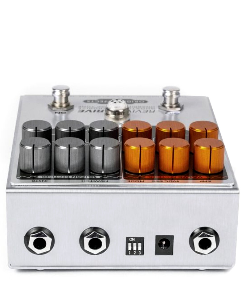 RevivalDrive incorpora peculiarità ingegnose che ne accrescono la sua flessibilità: un set di interruttori DIP sul retro del pedale consente di cambiare il canale rettificatore da Valve (valvolare) a Silicon (transistor) e di passare di conseguenza da un alimentatore di tipo americano ad uno britannico. Cambia la frequenza e quindi la risposta timbrica e cambiano le armoniche quando vengono alzati volume e distorsione: in buona sostanza, è il cosiddetto Ghost Tone che va ad aggiungersi al segnale.