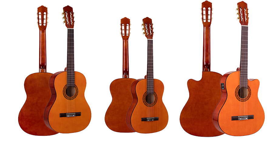 Primera Plus – Questa serie di chitarre con top Spruce e tastiera in palissandro in grado di sviluppare timbriche calde e rotonde, è ora disponibile nei formati 4/4 e 3/4, così come nella versione a spalla mancante elettrificata (Preamp E-2T/accordatore ed uscita jack/XLR).
