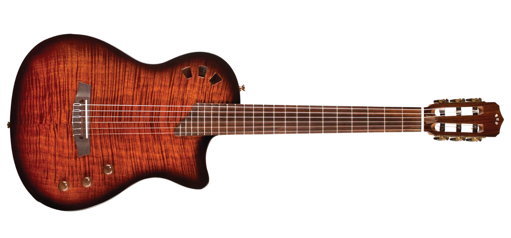 Il cuore del progetto è il rivoluzionario sistema Stage Pickup sviluppato con Fishman (dotato di controlli Volume, EQ e Body Blend), abbinato a un body a singola spalla mancante (cutaway) totalmente scavato allo scopo di ridurne il peso e consegnare la massima enfasi alla risonanza. Dal canto loro, le venature dell’acero fiammato favoriscono il volume del suono generato, il quale fuoriesce dalle tre buche strategicamente posizionate a ventaglio sulla spalla superiore del top.