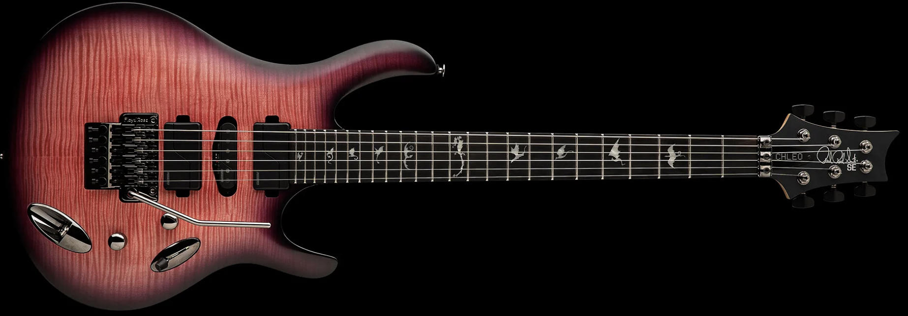 Il body è in mogano abbinato a un top in acero, mentre il manico, anch’esso in acero, si dota di una tastiera in ebano: in sostanza, una combinazione di legni pensata per generare sonorità brillanti, solide e decisamente articolate. 24 tasti corredano la tastiera abbellita dai segnatasti Eclipse Dragon, mentre la paletta riporta il logo PRS ed il nome Chleo “puntinato”.