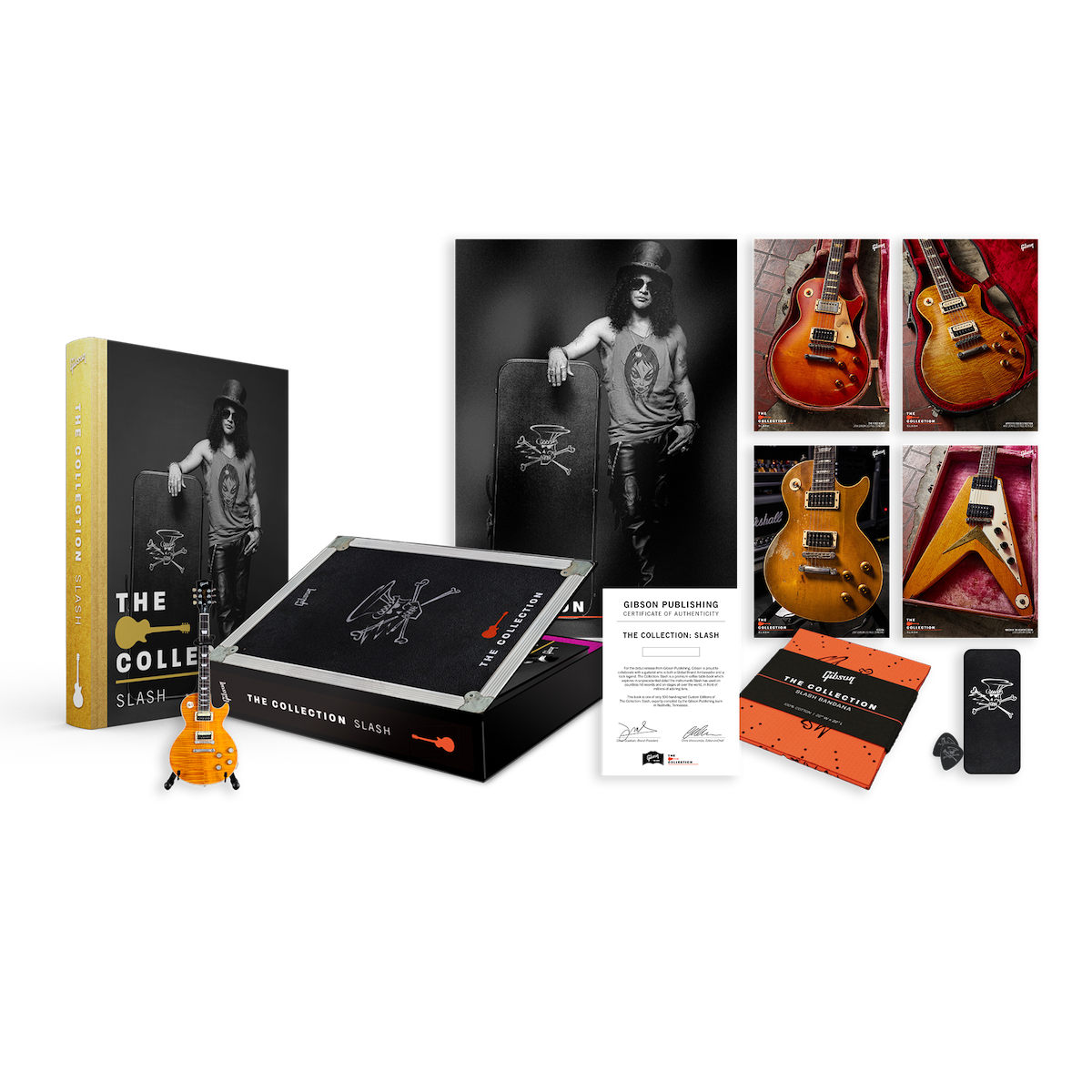 Custom Edition – Libro autografato da Slash. Brossura dorata e tiratura limitata a 500 copie. Di corredo, miniatura della Les Paul Heaven Appetite, bandana, plettro Dunlop, poster e certificato di autenticità – Prezzo: USD 999,00