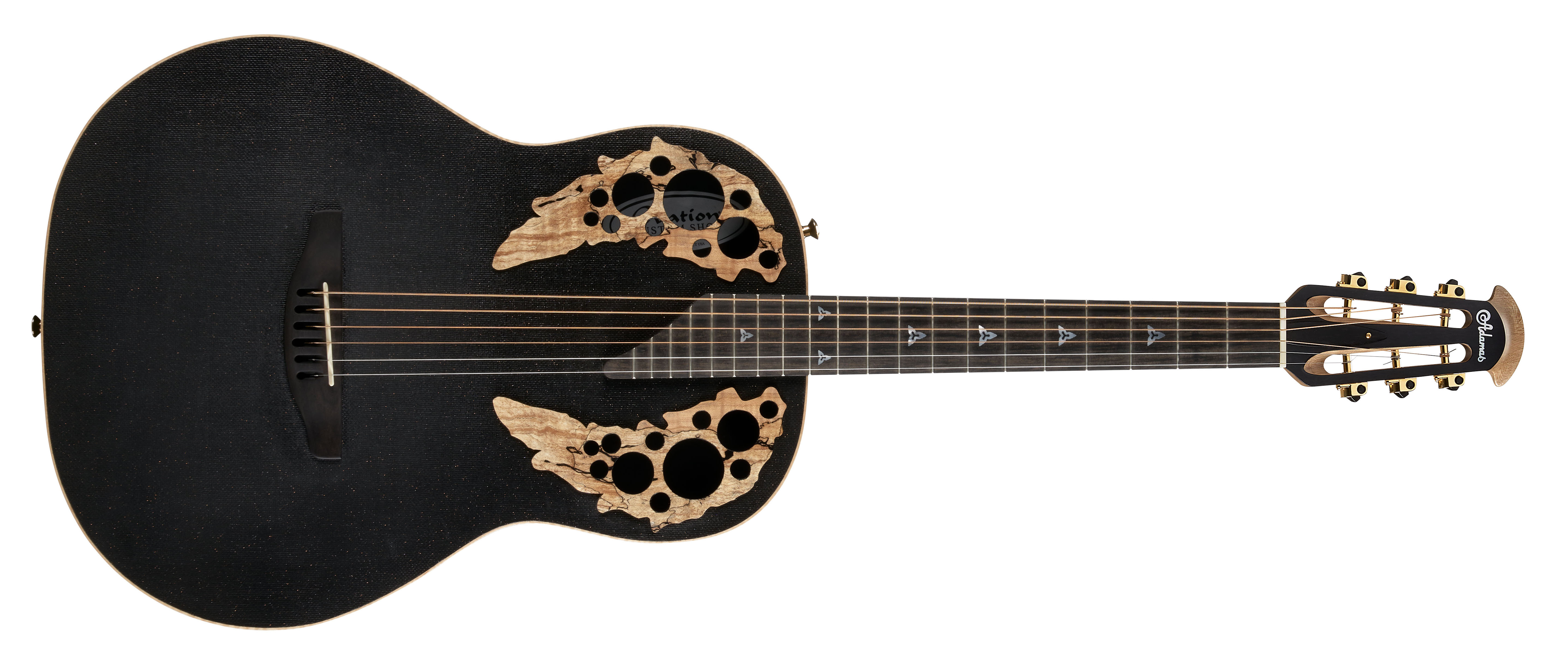 Scala corta e manico che si innesta al body al 12esimo tasto e tastiera agile e svasata pensata per il fingerstyle e dunque per agevolare il movimento delle mani. Body di media profondità in Lyrachord® ed inserti di acero attorno ai fori di emissione su un top in fibra di carbonio. Paletta dotata di due slot. Ponte Ovation Keyhole, ancoraggio delle corde tramite brevetto a tutt’oggi in registrazione, piastrina in grafite sotto il ponte, all’interno del body: il tutto, ad incrementare definizione del suono e sustain. Custodia rigida e sagomata in dotazione. Prezzo: 4.199,99 dollari