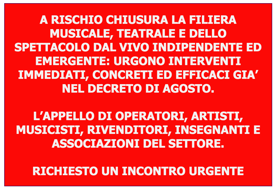 Gli artisti e operatori del settore esprimono il loro ringraziamento per le azioni adottate sin qui dal Governo e Mibact ma chiedono a gran voce la necessità indifferibile di ulteriori sostegni per recuperare il fatturato perduto da febbraio a giugno, e che nel caso degli esercenti la vendita di strumenti musicali si protrarrà, come da previsioni di mercato, fino a marzo 2021. Necessitano misure che consentano concretamente e nell’immediato futuro la realizzazione di un maggior numero di live, di spettacoli e di progetti educativo-musicali, così come l’emanazione di nuovi bandi per produttori, editori, associazioni, in modo da consentire la ripartenza di festival, tour, tournée, con benefici in favore di autori, attori ed in generale artisti, operatori e docenti del settore didattico-musicale e teatrale.