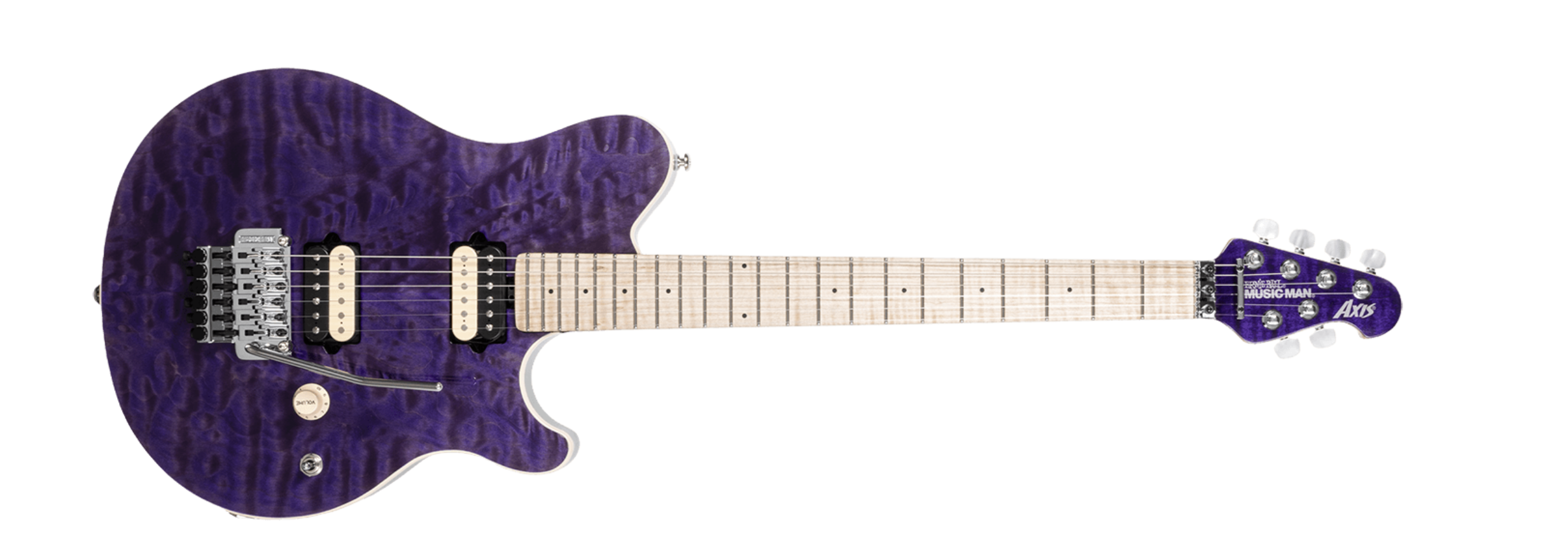 Il manico in acero figurato mantiene il profilo asimmetrico, elemento distintivo della Axis, mentre la tastiera è equipaggiata con 22 tasti in acciaio inox e side dots luminescenti, pensati per la visualizzazione in contesto live. La giunzione manico-corpo è affidata alla classica piastra a cinque viti, soluzione proprietaria Music Man che privilegia solidità strutturale e trasmissione delle vibrazioni.