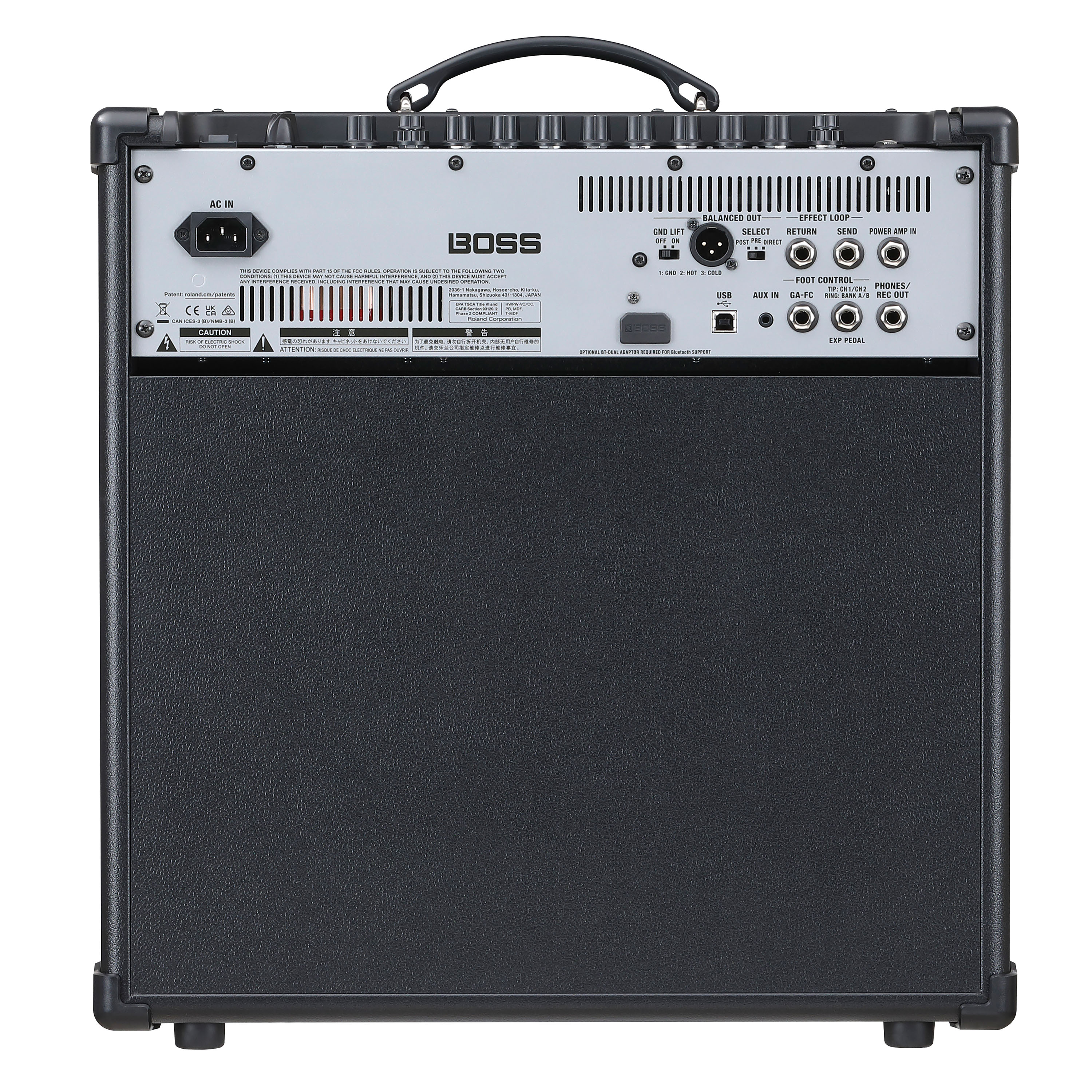 Sul pannello posteriore trovano posto le seguenti prese a jack ¼”: Input, AC In, Balance Out, FX Loop (Send/Return), Power Amp In, prese per pedale d’espressione esterno e foot controller GA/FC, per cuffie/registrazione, stereo (con emulazione del cab microfonato e tre impostazioni Air Feel). Presa Aux In (mini jack). Selettori Ground Lift, e presa USB (tipo B) per l’interfaccia con software di produzione musicale su computer. Presente infine uno slot per adattatore Boss Bluetooth Audio Midi Dual Adaptor (opzionale) per la regolazione delle impostazioni in modalità wireless da un dispositivo mobile iOS o Android: una peculiarità decisamente utile nelle performance live.