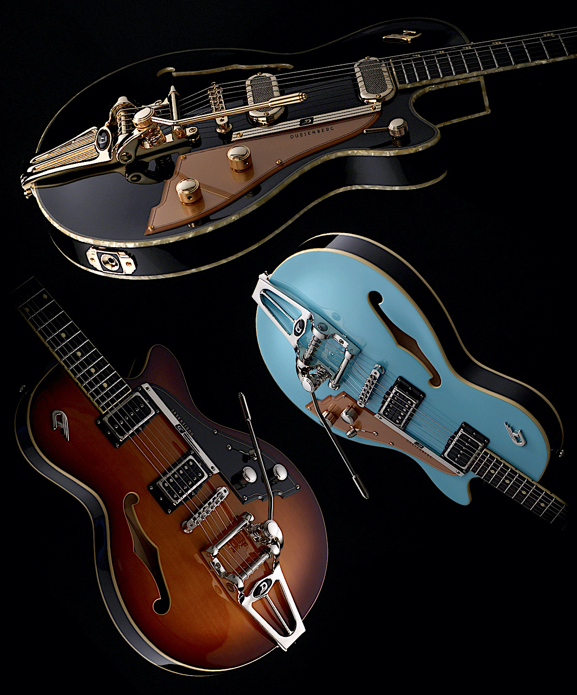 Ma non è tutto in quanto alle finiture del catalogo Duesenberg… La Phonic si propone ora nella finitura Black con hardware dorato e, parlando di Black (nero), se ne appropriano anche la Fullerton CC e Fullerton TV, le due semihollow sino ad ora proposte soltanto in Vintage White.