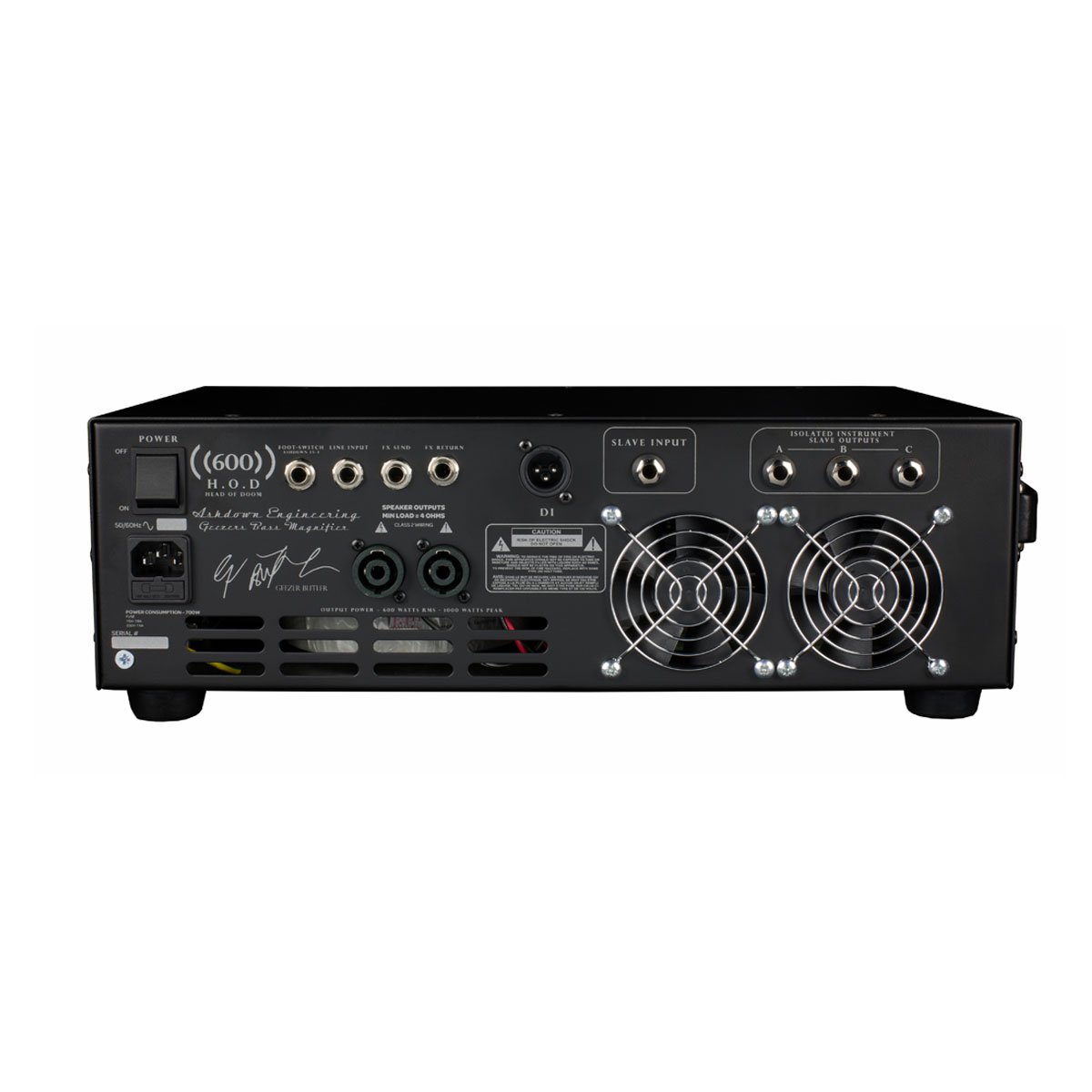 Il pannello posteriore della Head of Doom ospita connettività di tipo professionale: tre uscite Isolated Instrument Slave Outputs (A, B e C) per sampler o sorgenti di suono esterni, più le uscite FootSwitch, Line Input, FX Send, FX Return; più due connettori per gli speaker. Due ventole di raffreddamento, presa di alimentazione e pulsante On/Off per accensione/spegnimento. In aggiunta, la firma autografa di Geezer Butler.