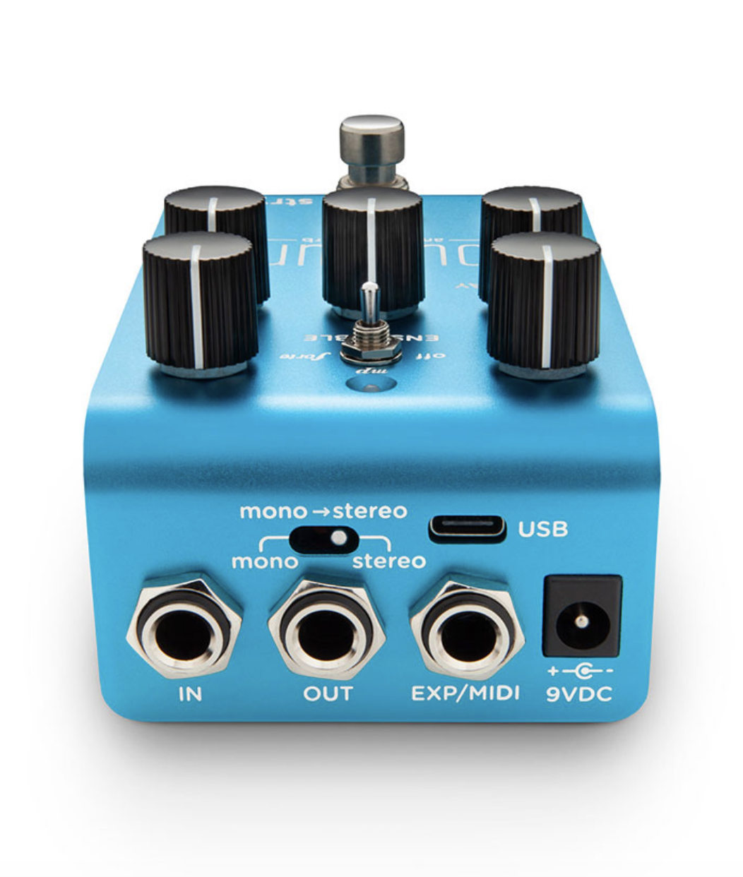 Tre prese a jack sono collocate sul pannello posteriore del pedale: In, Out e Exp/Midi. Quest’ultima per la connessione di un pedale d’espressione a controllare gran parte dei parametri del pedale, e per l’implementazione Midi (fino a 300 preset). Si aggiungono la connessione USB-C per l’invio dei parametri Midi da controller o DAW, l’interruttore Mono/Stereo (per le regolazioni mono-to-mono, mono-to-stereo e stereo-to-stereo) e la presa di alimentazione 9V-DC.