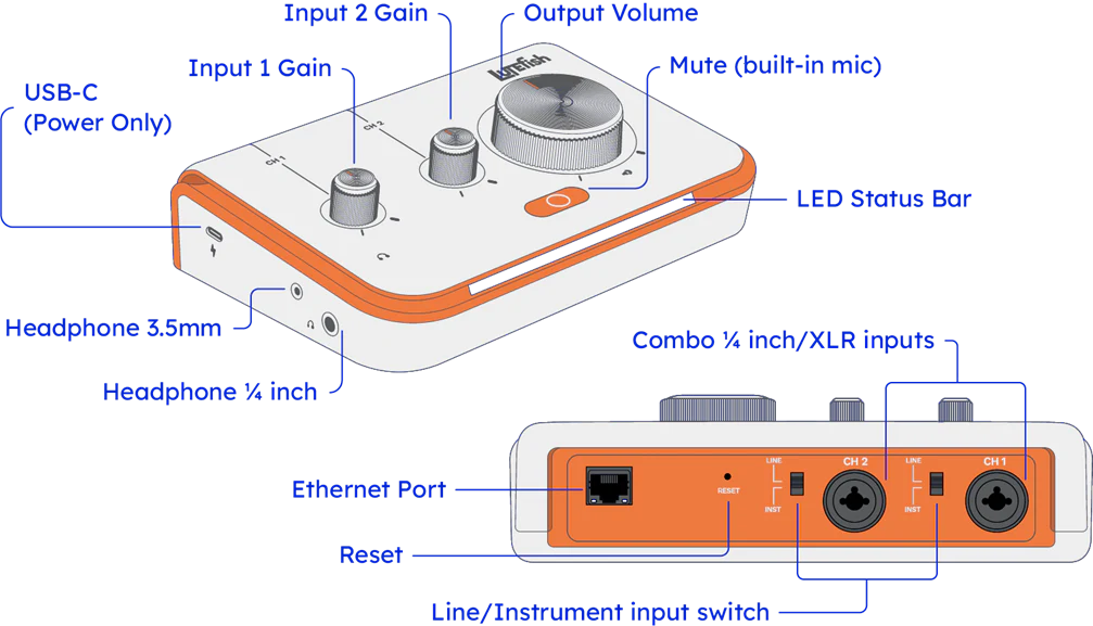 per una distanza di oltre 800 chilometri (500 miglia) – Qualità audio di tipo professionale (48 Hz) – Registrazione e download di ogni performance – Canali 1 e 2 – Volume – Mute – Prese cuffie 3,5 mm e ¼” – Porta USB-C – Due ingressi audio XLR ¼” con preamp in Classe A – Connessione Internet veloce (fibra/cavo) – Porta Ethernet – Due ingressi Line/Instrument – Reset