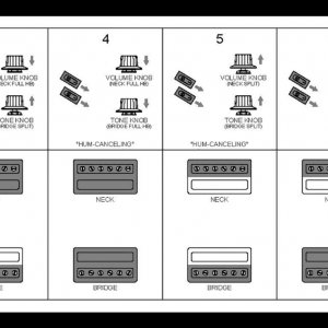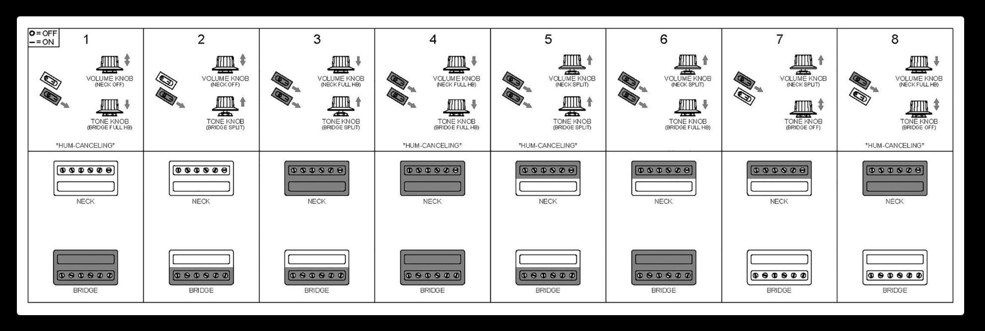 1) pickup ponte/hum canceling. 2) ponte/coil split. 3) ponte/coil split+manico. 4) ponte+manico/hum canceling. 5) ponte/coil split+manico/coil split/hum canceling. 6) ponte+manico/coil split. 7) manico/coil split. 8) manico/hum canceling