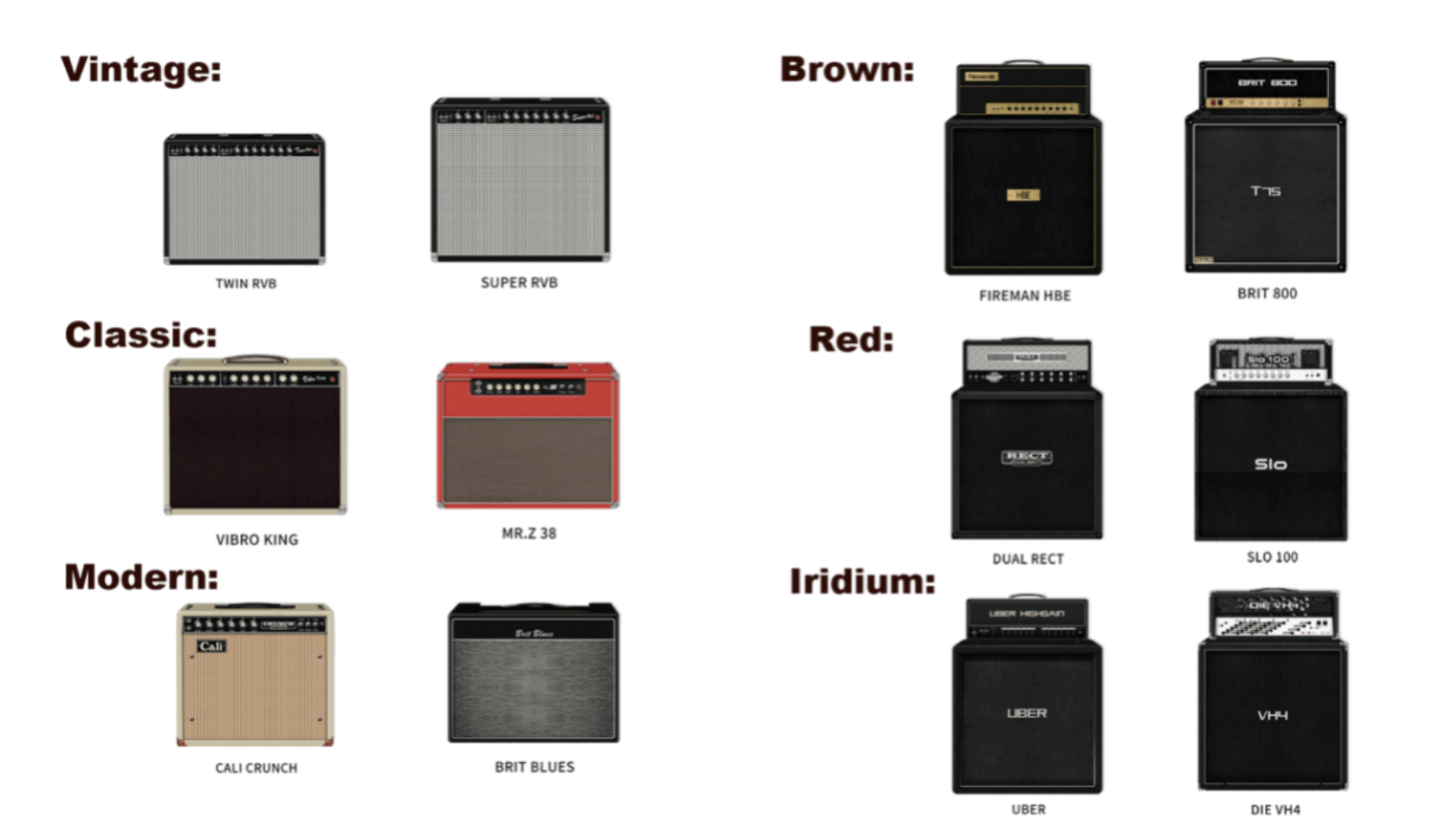 – Mr.Z 38. Modern = Cali Crunch – Brit Blues. Brown = Fireman HBE – Brit 800. Red = Dual Rect – SLO100. Iridium = Uber – Die VH4