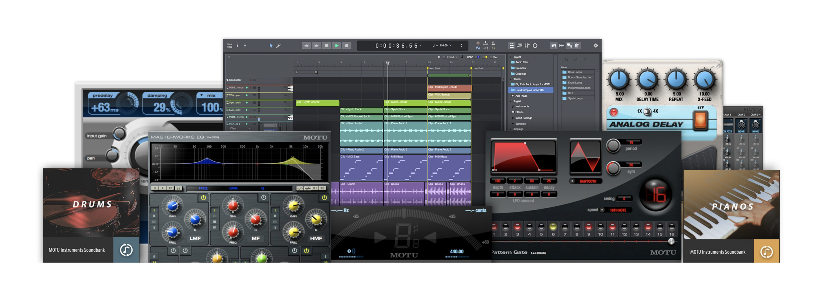 - Performer Lite Workstation: software per registrazione, edit, mix e mastering (oltre 100 virtual instruments e dozzine di effetti plug-in, processori per chitarra e quant’altro), più i popolari suoni/sample di Lucisamples e Loopmasters a marchio Big Fish Audio
