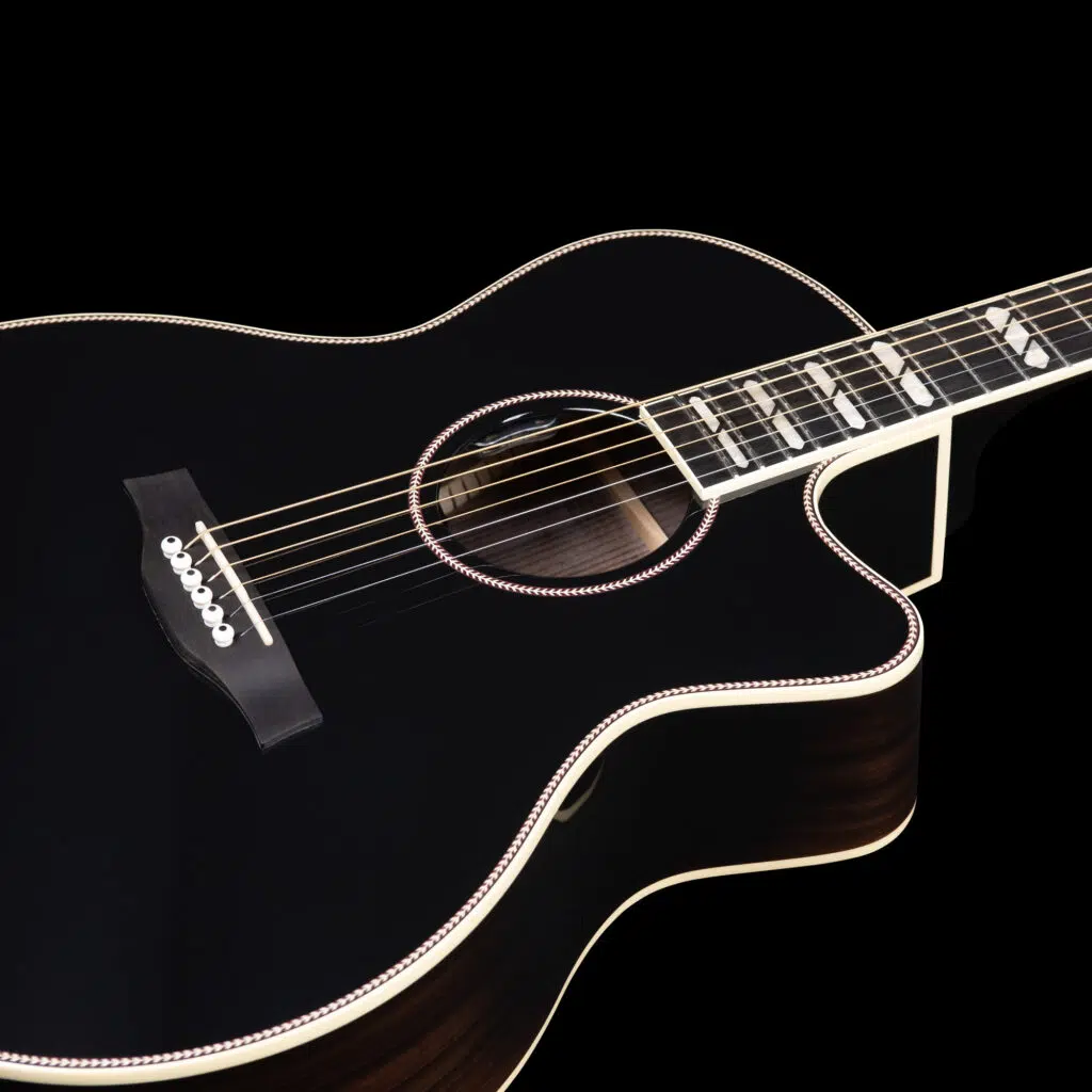 Shape: Mini-jumbo – Scala: 25,5” – Fondo/Fasce: Solid Rosewood – Top: Solid Spruce – Manico: Mahogany – Tastiera: Ebony (radius mm 406,4) – Tasti: 21 Medium – Capotasto: Bone (ampiezza mm 43,688) – Ponte: Ebony – Elettronica: L.R. Baggs HiFi Pickup System – Corde: DR Dragon Skin Steel 012-071