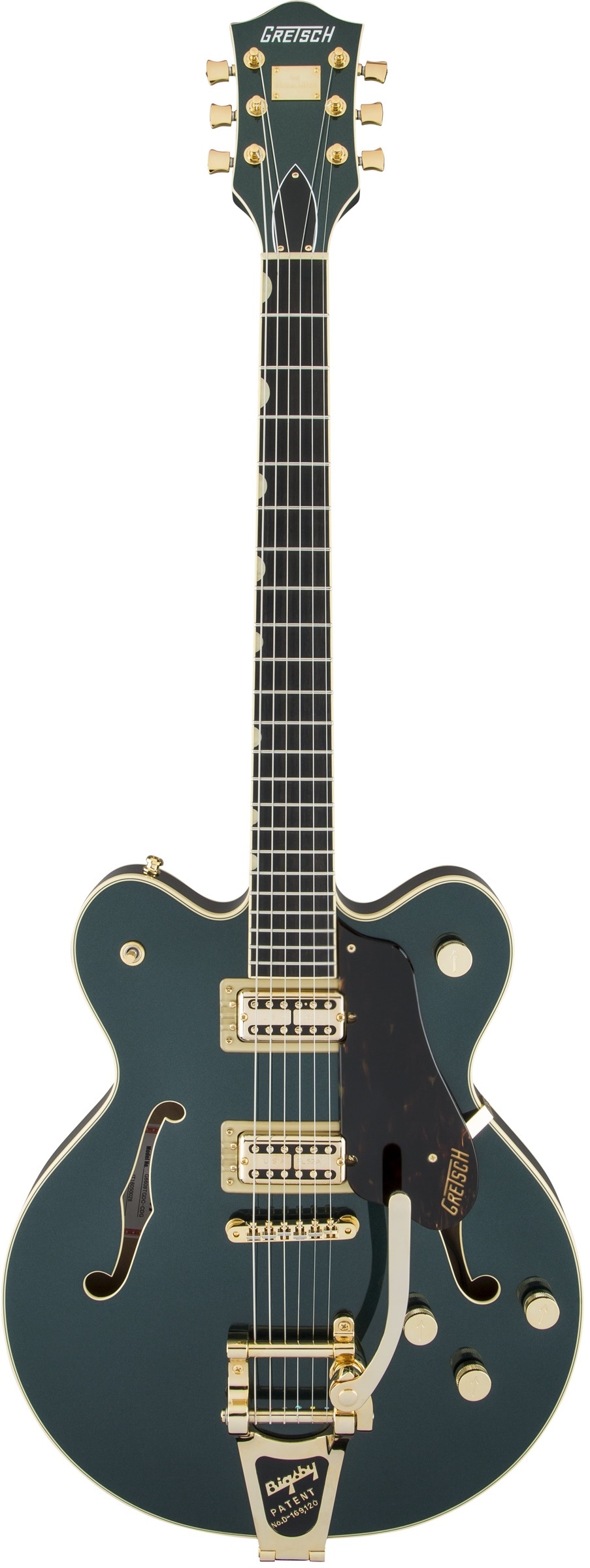 (Center Block) in abete. Ponte fisso Adjusto-Matic, vibrato Bigsby B7CP String-Thru, meccaniche autobloccanti. Due pickup Full’Tron, circuito treble-bleed, controllo di tono No-load, resistenze Squeezebox PIO. Finiture: Cadillac Green e Vintage White con hardware Gold.