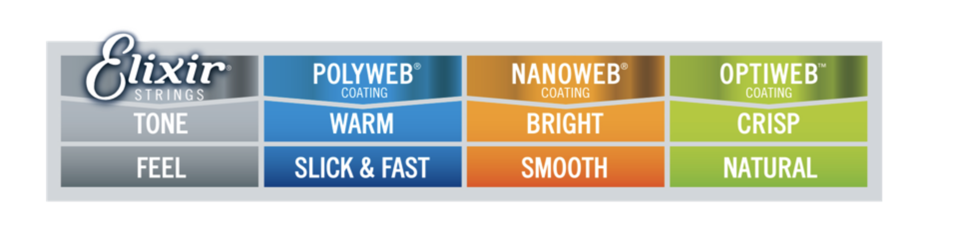Se le corde Elixir Optiweb consegnano un tone vivace ed un feel naturale, le Nanoweb consegnano brillantezza ed un feel delicato. Dal canto loro, le Polyweb sono dedicate al chitarrista che necessita di un tone caldo e avvolgente ed un feel frizzante.