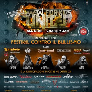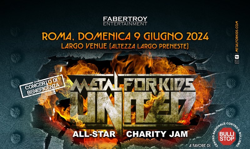Con oltre 6 ore di musica dalle 17.30 a mezzanotte, il Metal For Kids United! del 2024 sarà un grande evento benefico contro il bullismo, il cui ricavato dell’incasso sarà devoluto al Centro Nazionale Contro il Bullismo - Bulli Stop di Roma (http://www.bullistop.com) per divulgare e promuovere la prevenzione contro la problematica del bullismo e del cyberbullismo nell’età scolastica e dell’adolescenza.