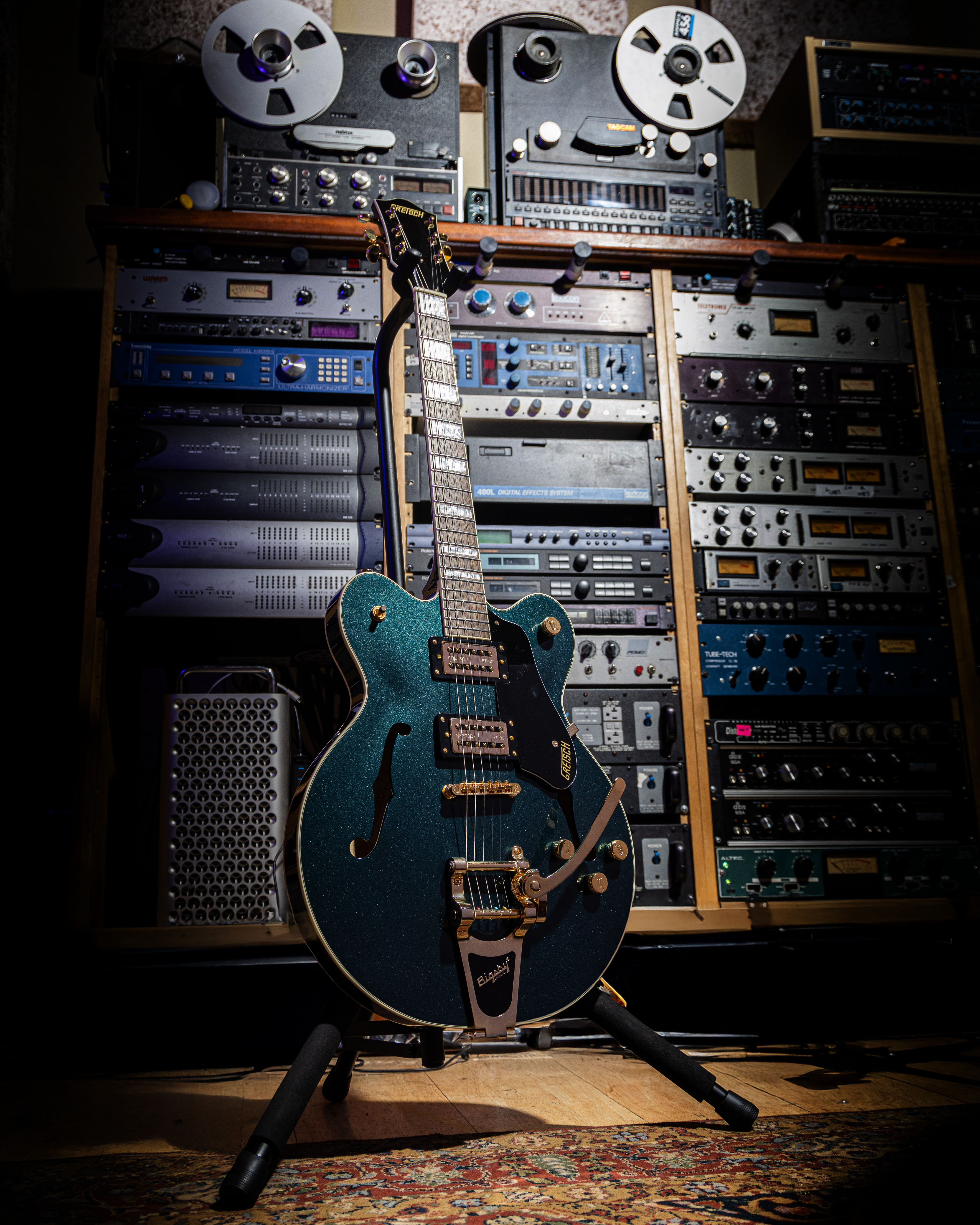 Inserita nella rinnovata serie e realizzata in edizione limitata, la nuova Gretsch G2420TG Streamliner è una chitarra hollow-body a singola spalla mancante, equipaggiata di due humbucker Broad’Tron BT-3S e del ponte Bigsby B60 con il suo inconfondibile aspetto retro. Finitura Cadillac Green e hardware dorato, inclusi pickup, pin e viti.