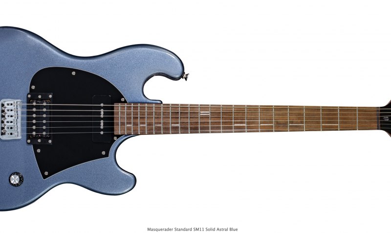 Con la soffice finitura Solid Astral Blue, la nuova Shergold Masquerader Standard SM11 manifesta all’istante i suoi tratti estetici: body con la spalla superiore corta e curvata all’ingiù, paletta con il top arrotondato, segnatasti tratteggiati in orizzontale ed un battipenna nero sagomato da linee arrotondate e squadrate al contempo. Hardware cromato. Due pickup posizionati a manico e ponte, selettore e due knob; in estrema sintesi, la mera espressione di un concept basato su semplicità ed efficienza.