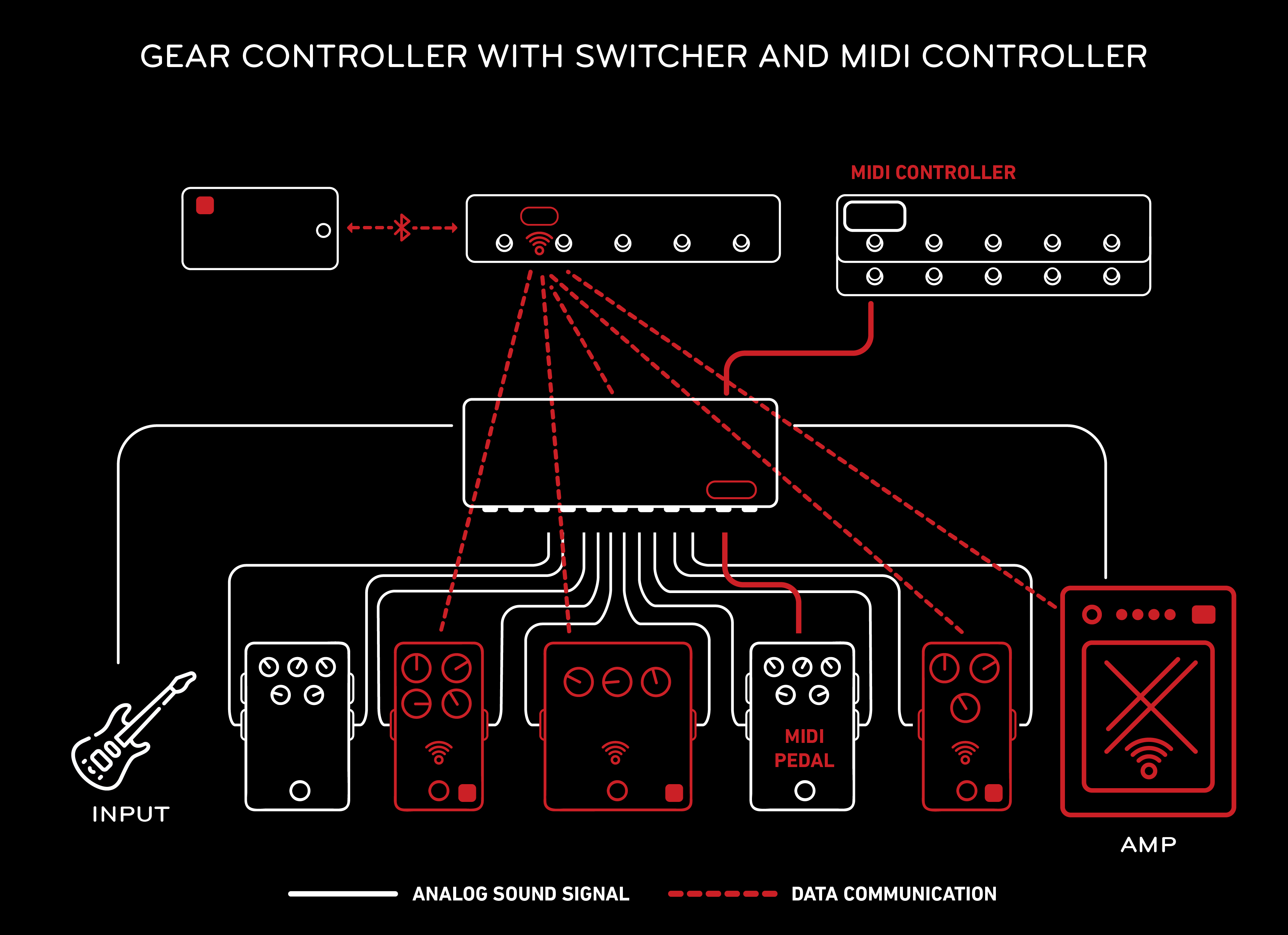 L’innovativa tecnologia SonicMind è un peculiare protocollo adottabile da ogni costruttore di gear analogici (effetti a pedale, amplificatori e switcher per chitarra) perché possano essere controllati da remoto, in tempo reale e in modalità wireless, mantenendo analogico il segnale audio ad ogni step del suo percorso.