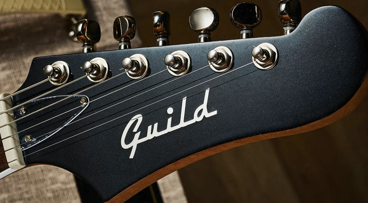Guild non tralascia certo l’aspetto estetico e codifica allo scopo cinque nuove brillanti finiture che denomina Rose Quartz Metallic, Evergreen Metallic, Black Metallic, Glacier Blue Metallic e Scarlett Red Metallic. Logo Guild in stile anni ’80 sulla paletta che fa il paio con la finitura del body.