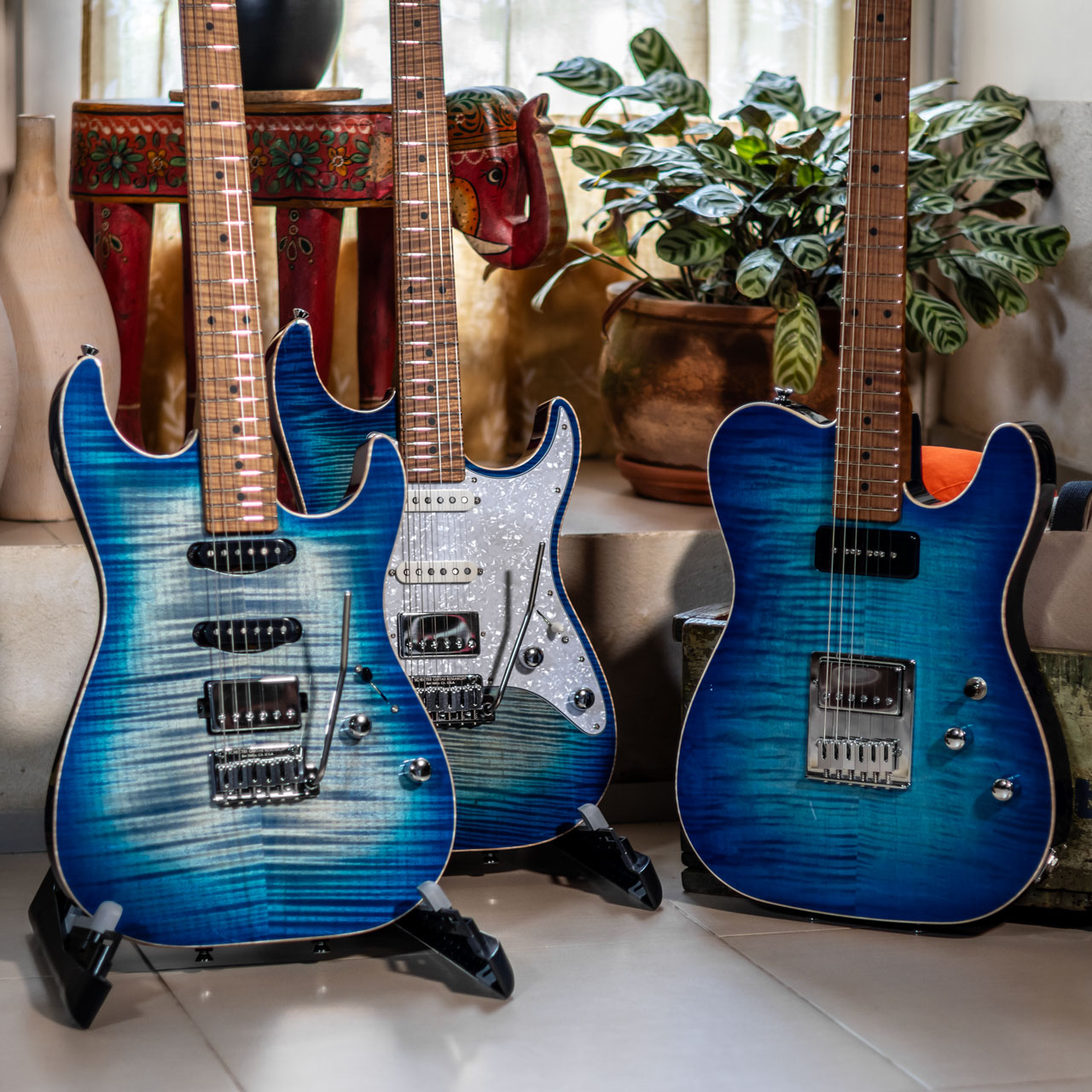 SUNSET CUSTOM HSS RESERVE – made in USA, Schecter Custom Shop – Finitura: Sky Blue, lucida – Costruzione: bolt-on – Scala: 25,5” – Body: Ontano (selezione Reserve) – Top: Acero fiammato (selezione Reserve) – Manico: Acero fiammato, roasted (selezione Reserve), finitura: satinata – Tastiera: Acero fiammato, roasted (selezione Reserve) – Tasti: 22 – Segnatasti: Vintage dot – Capotasto: GraphTech Black Tusq – Meccaniche: Schecter autobloccanti – Finitura paletta: Natural, lucida – Battipenna: madreperlato – Ponte: Schecter Vintage Tremolo – Pickup Schecter: 1x Humbucker Sunset Strip + 2x Single Coil Dark Side – Selettore: 5 posizioni – Controlli: Volume, Tone con push/pull per lo split dell’humbucker – Hardware: cromato – Custodia rigida: Schecter